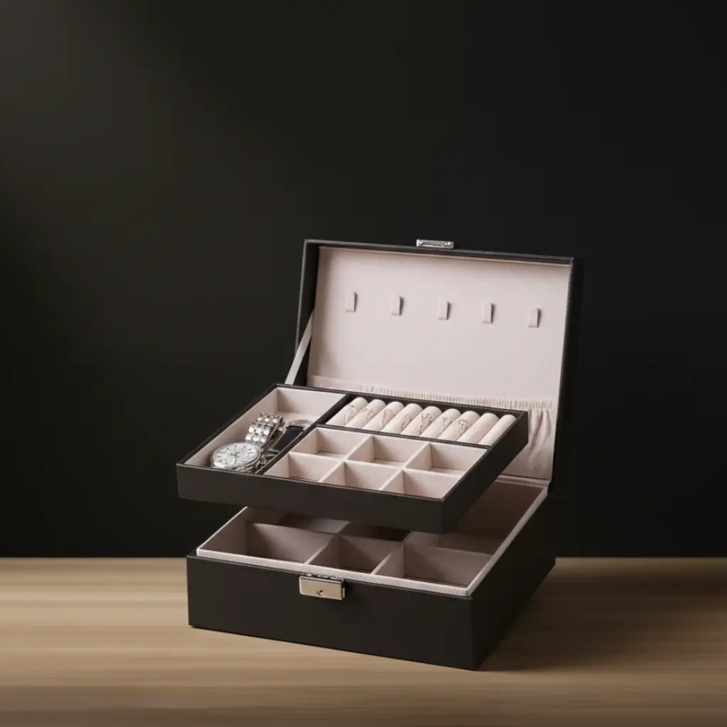 Diseño de 3 Niveles: La caja cuenta con múltiples bandejas, permitiendo un almacenamiento ordenado y un fácil acceso a todas tus joyas.