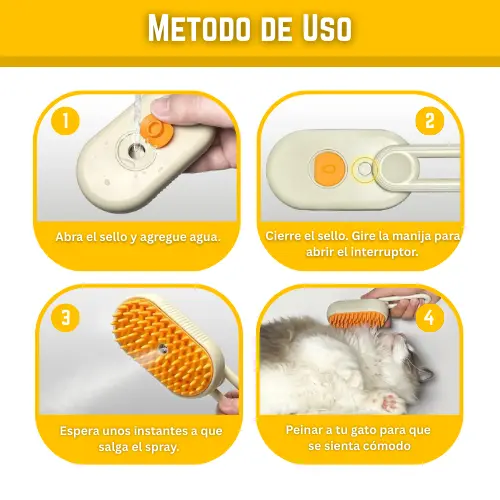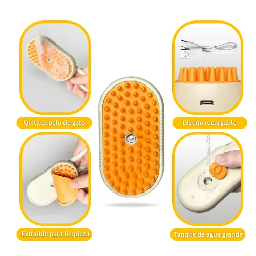 A diferencia de los cepillos comunes, el nuestro integra tres funciones vitales en una sola herramienta: cepillado, masaje y limpieza con vapor. Olvídate de los productos químicos y de los cepillos que lastiman. Esta es la forma más suave y efectiva de cuidar el pelaje de tu mejor amigo.